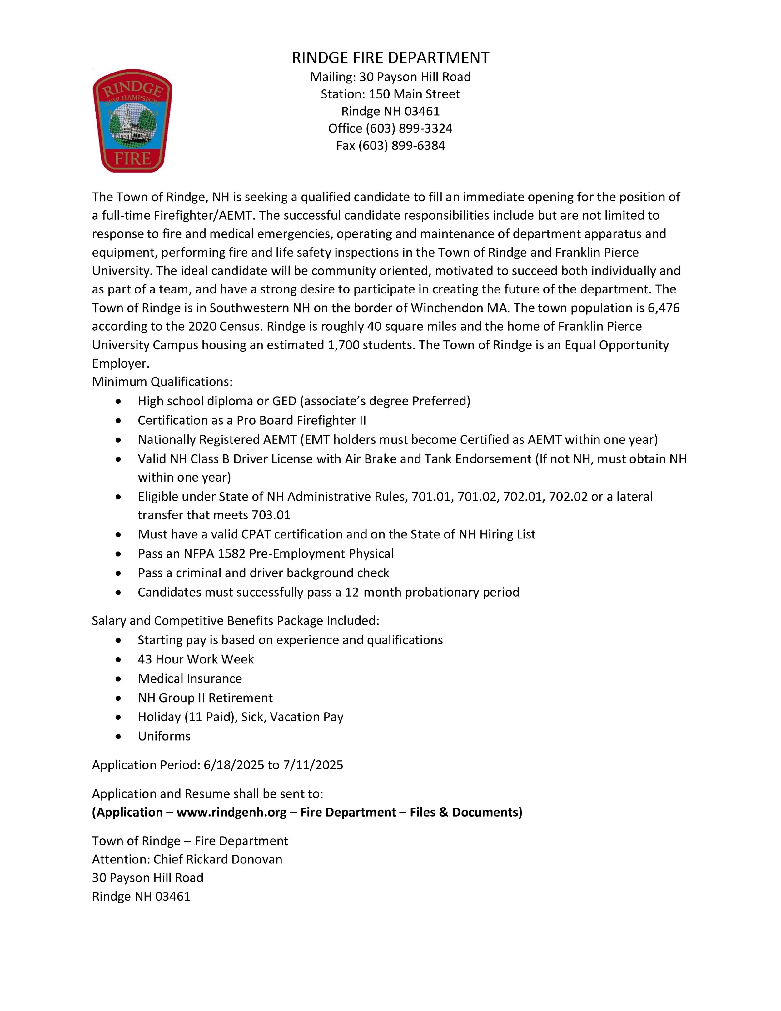 The Town of Rindge is hiring a full-time Firefighter/AEMT.