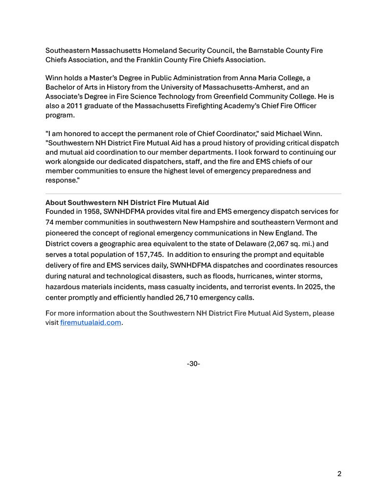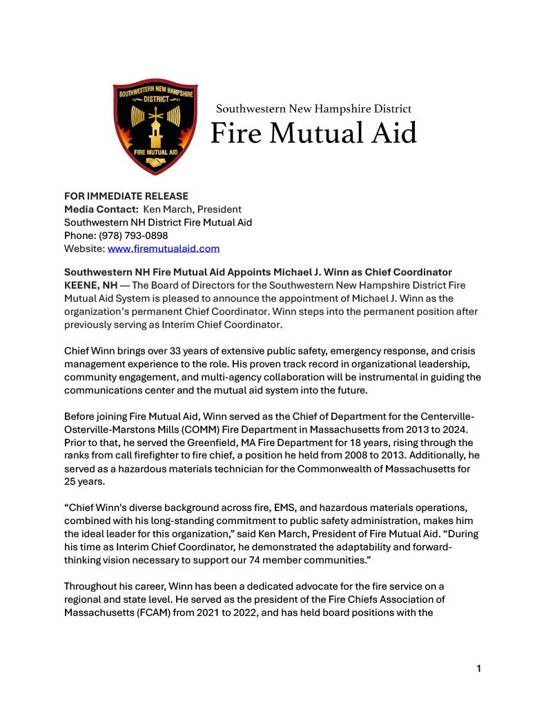 Southwest Fire Mutual Aid Appoints New Chief April 10, 2026 Fire Mutual Aid Southwest Fire Mutual Aid Appoints Mike Winn as New Chief Coordinator